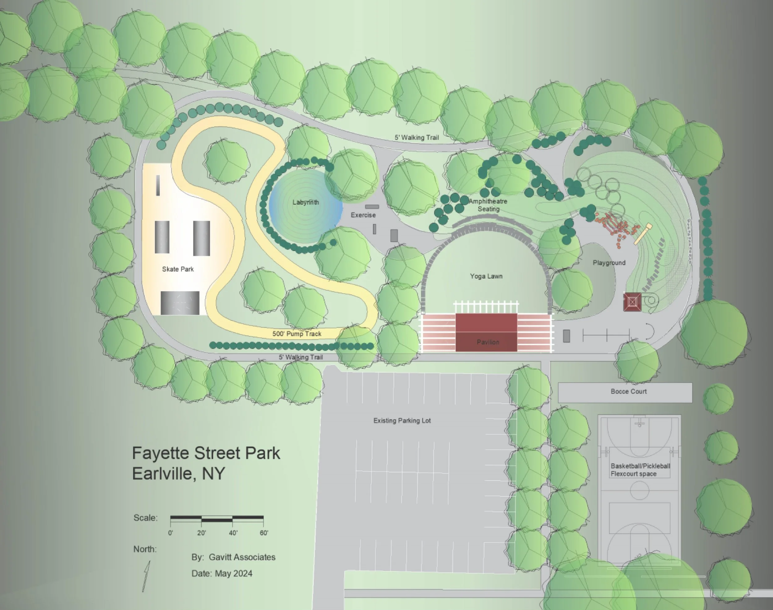 In 2025, the Village of Earlville received $627,847 through the Office of Parks, Recreation, and Historic Preservation for the redesign and construction of the pavilion, playground, and skate park at on Fayette St. The PCD has been working with the Village and the Earlville for Earlville community group since 2020 to revitalize this important community space. With the planned construction of new senior housing in the adjacent former school building, Fayette St. Park will be transformed into a unique multi-generational space in southern Madison County. The PCD is excited to work with Earlville to make the community’s vision a reality.